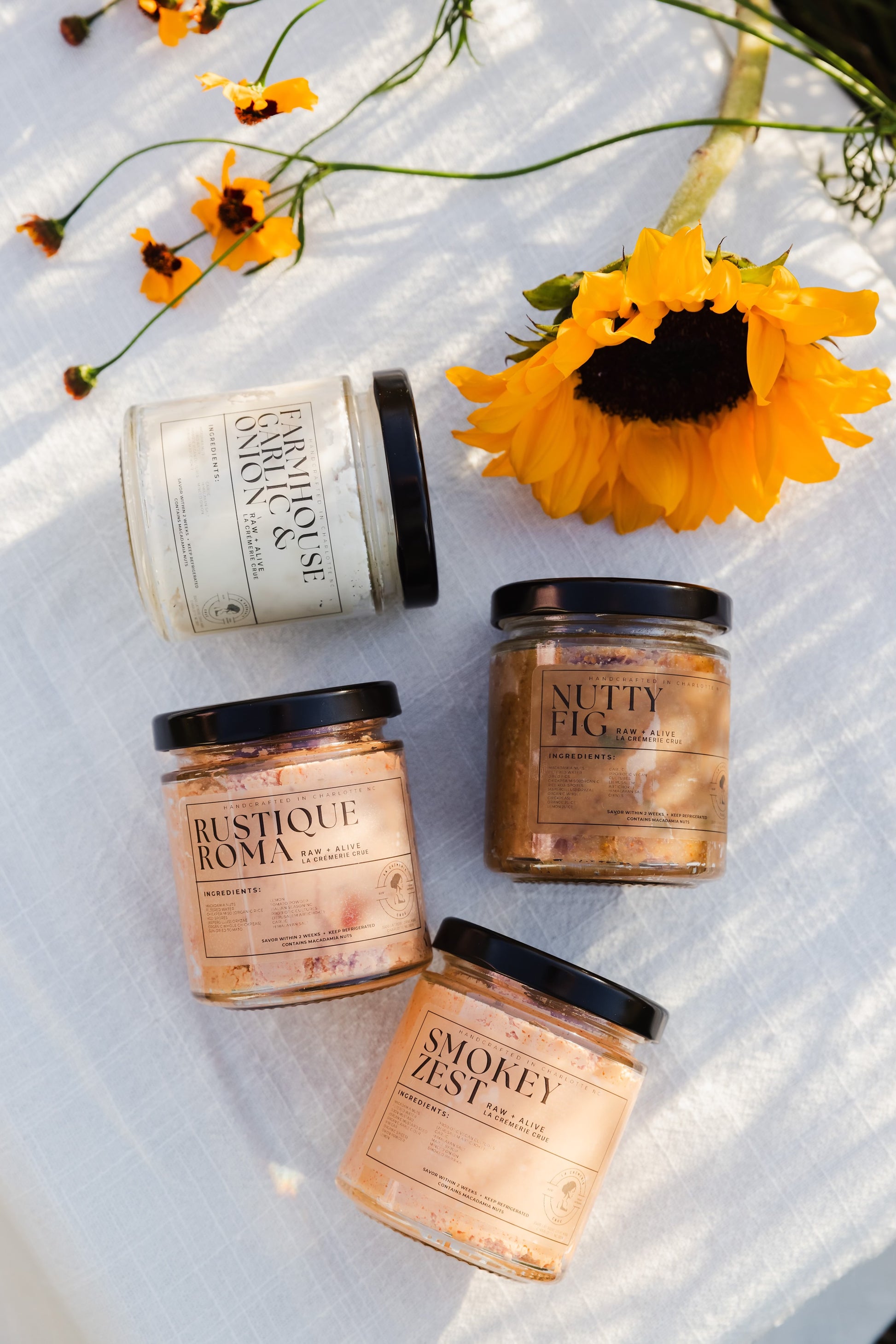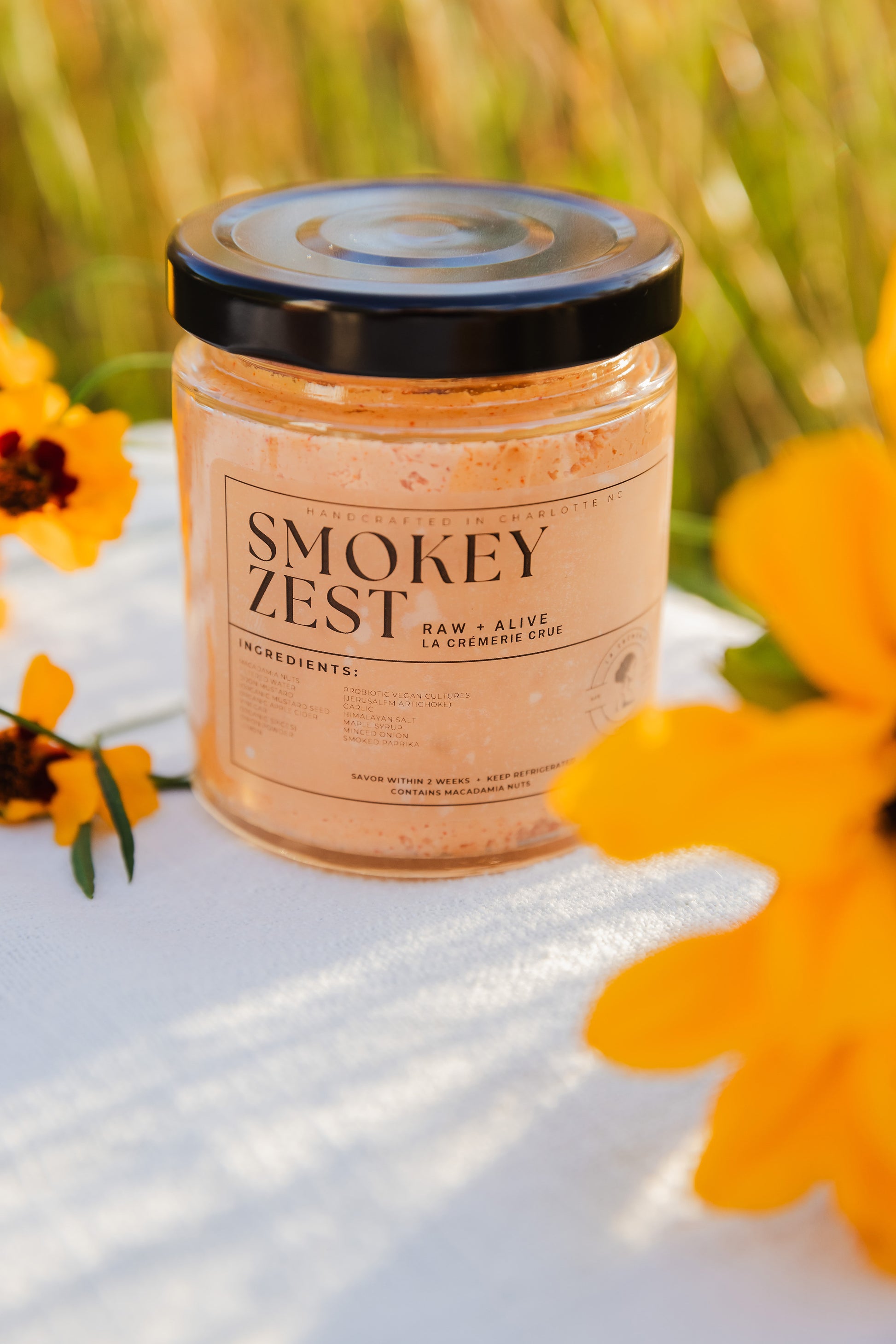 Macadamia nuts, vegan probiotic cultures (Jerusalem artichoke), smoked paprika, Dijon mustard, lemon, onion powder, minced garlic, maple syrup, chickpea miso, Himalayan salt.