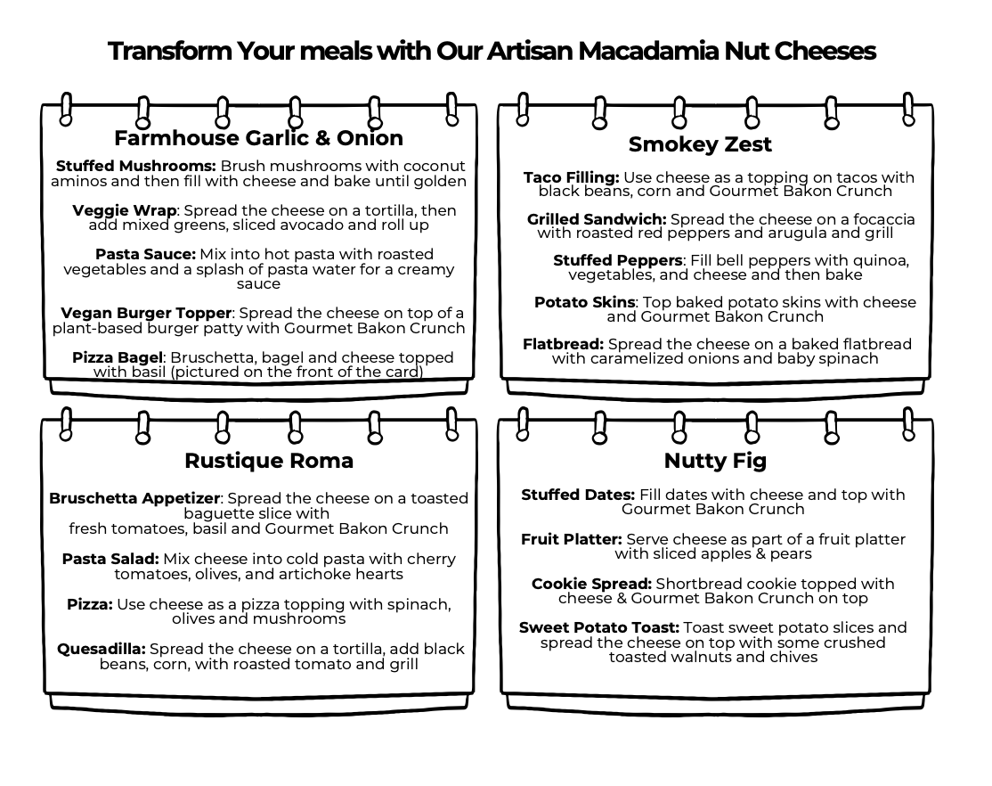 Rustique Roma is crafted with simplicity and purity in mind, the cheese is a homage to vibrant italian countryside, using only a few select ingredients. At its core, Rustique Roma features a rich blend of tomato powder, garlic, and italian seasoning, embodying the essence of Italian cheese without any dairy.